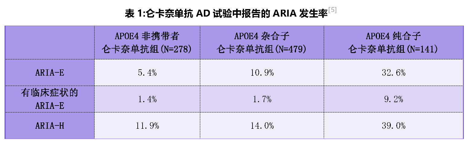 ApoE ε4 等位基因純合子患者的淀粉樣蛋白相關影像學異常(Amyloid-related imaging abnormalities,ARIA)發(fā)生率高于該基因雜合子和未攜帶該基因的患者,包括有癥狀、嚴重和重度ARIA。處方信息指出,在開始進行治療之前應進行 ApoE ε4 基因檢測,以了解發(fā)生 ARIA 的風險。