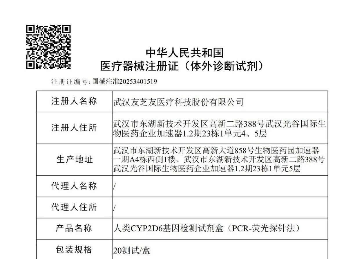 在精準(zhǔn)醫(yī)療的浪潮中,藥物基因檢測(cè)正逐漸成為醫(yī)療領(lǐng)域的 “導(dǎo)航儀”。武漢友芝友醫(yī)療科技股份有限公司(簡(jiǎn)稱芝友醫(yī)療)自主研發(fā)的“人類CYP2D6基因檢測(cè)試劑盒(PCR-熒光探針法)”正式獲得國家三類醫(yī)療器械注冊(cè)證!這不僅是對(duì)公司研發(fā)實(shí)力的高度認(rèn)可,更將為臨床診療帶來全新的精準(zhǔn)化解決方案,助力無數(shù)患者邁向更高效、更安全的治療之路。