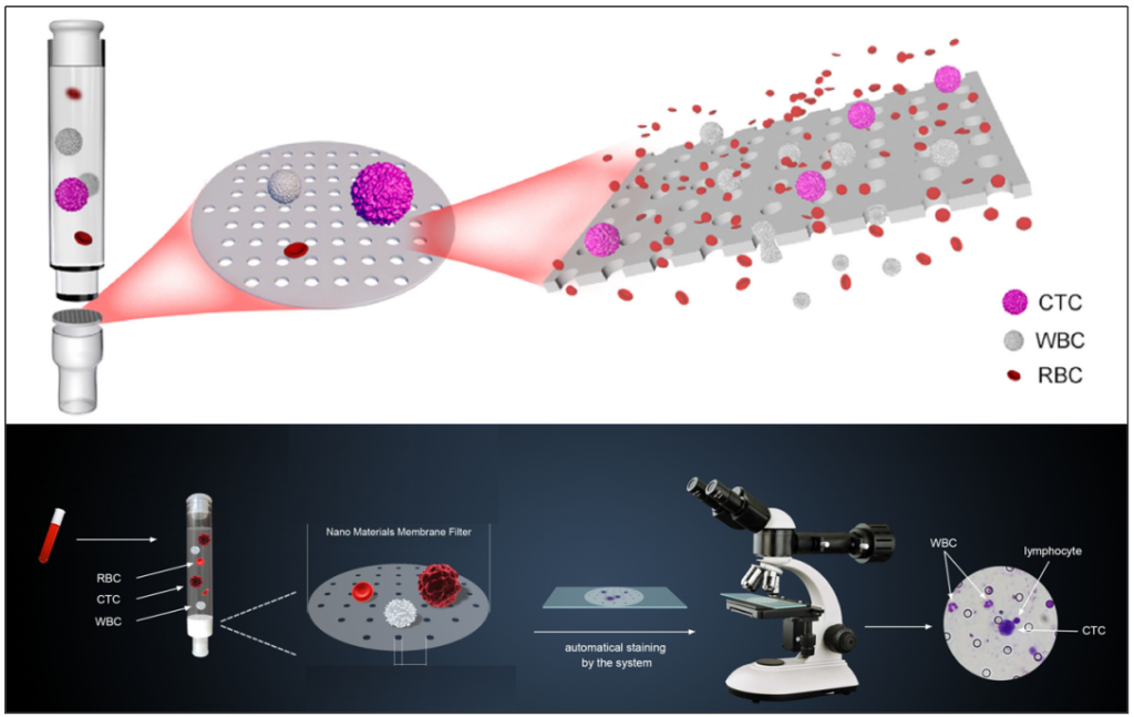 其優(yōu)勢在于不破壞CTCs形態(tài),不依賴CTCs的表面抗原,同時(shí)兼容多種下游分析技術(shù),利于后續(xù)對單個(gè)CTCs進(jìn)行形態(tài)學(xué)、免疫細(xì)胞學(xué)及遺傳學(xué)特征的研究。其中芝友醫(yī)療CTCBIOPSY系統(tǒng)屬于“微過濾”裝置,核心部件是一個(gè)濾孔分布均一的納米微篩,主要依據(jù)CTCs與正常的血源性及非血源性細(xì)胞體積大小和形變能力的差異,從外周血中分離富集CTCs。