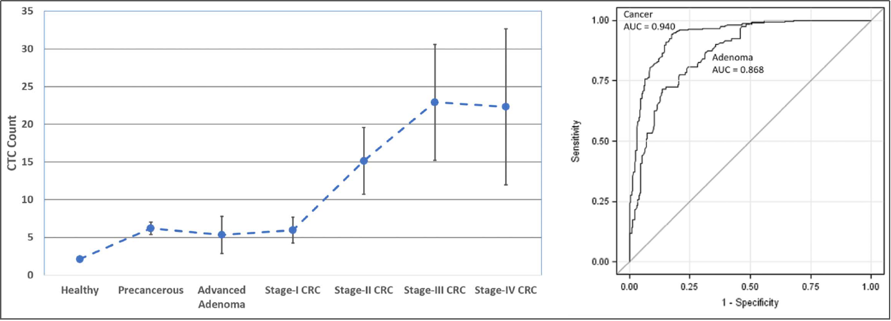 2018年ASCO會(huì)議的一項(xiàng)納入620例受試者的前瞻性臨床研究表明,通過CTC檢出CRC癌前病變的敏感性為76.6%,與結(jié)腸鏡的篩查效果(76%-94%)接近;而對于CRC的敏感性高達(dá)86.9%,超過糞便潛血試驗(yàn)(FOBT)的篩查效果(62%-79%),與結(jié)腸鏡檢查的效果相同(75%-93%)。