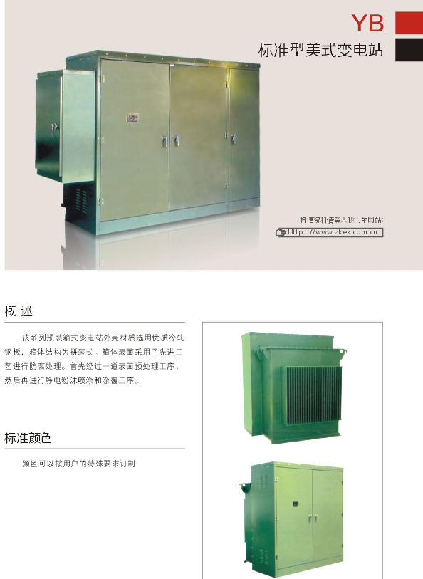 該系列預裝箱式變電站外殼材質選用優良冷軋鋼板,箱體結構為拼裝式。箱體表面采用了新型工藝進行防腐處理。首先經過-道表直預處理工序,然后再進行靜電粉沫噴涂和涂覆工序。