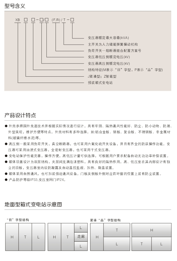 Xb系列預裝式箱式變電站系我公司為滿足城網建 設的需求,自行設計開發的系列產品.該系列產品是. 一種將中壓開關設備、變壓器、低壓配電設備按一 定接線方案組合成一體的成套配電設備。