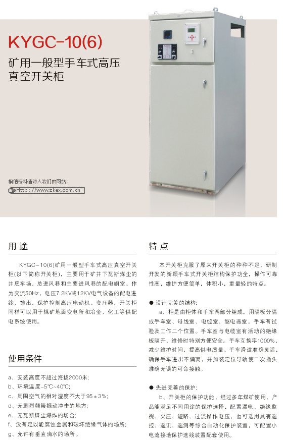 KYGC- 10(6)礦用-般型手車式高壓真空開關柜(以下簡稱開關柜),主要用于礦井下瓦斯煤塵的井底車場、總進風巷和主要進風巷的配電峒室。作為交流50Hz,電壓7.2KV或12KV電氣設備的配電進線、饋出、保護控制高壓電動機、變壓器。開關柜同樣可以用于煤礦地面變電所和冶金、化工等供配.電系統使用。